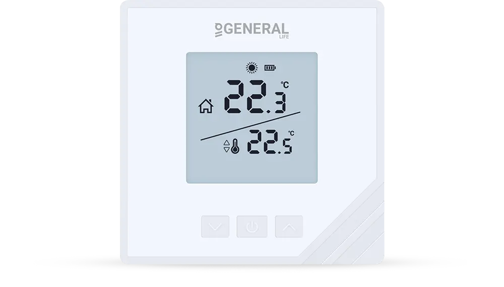 Aydınlatmalı LCD ekranı, anlık ve ayarlanan sıcaklık değerlerini net biçimde göstererek kullanım kolaylığı sağlar. Modern tasarımıyla öne çıkan bu oda termostatı, verimli ve ideal sıcaklık yönetimini mümkün kılar.