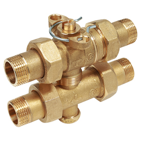 Üç yollu kontrol vanası, erkek-erkek rakor bağlantılı, ayar için by-pass ve geri dönüş vanalı.